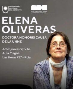 El Consejo Superior de la UNNE, aprobó el 10 de septiembre de 2025 otorgar la máxima distinción institucional a la Dra. Elena Oliveras. La postulación considera su excepcional trayectoria como filósofa, crítica de arte, curadora, docente e investigadora, cuyas contribuciones han enriquecido el pensamiento estético contemporáneo en Iberoamérica.